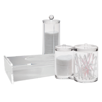 Praktische und hübsche Aufbewahrungsbehältnisse aus Acryl, für die hygienische Aufbwahrung von Kleinteilen wie z. B. Wattepads, Wattestäbchen, Kosmetiktücher, ... am Arbeitsplatz.
