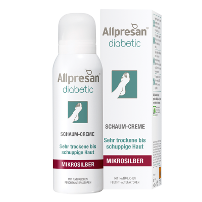 Die Allpresan® diabetic Mikrosilber Schaum-Creme ist speziell abgestimmt auf die Bedürfnisse diabetischer Haut und weist zudem die Vorteile der patentierten Allpresan® Schaum-Cremes (BarrioExpert®) gegenüber anderen Fußpflegeprodukten auf.