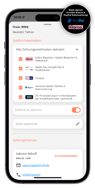 Beautinda beinhaltet ein TSE-konformes Kassensystem, das den aktuellen gesetzlichen Anforderungen entspricht. Neben der rechtssicheren Abrechnung lassen sich Funktionen wie Ratenzahlung, Kartenzahlung (z. B. über SumUp) und Datenexporte für Steuerberater nutzen. Damit lassen sich Zahlungsprozesse zentral steuern und dokumentieren.