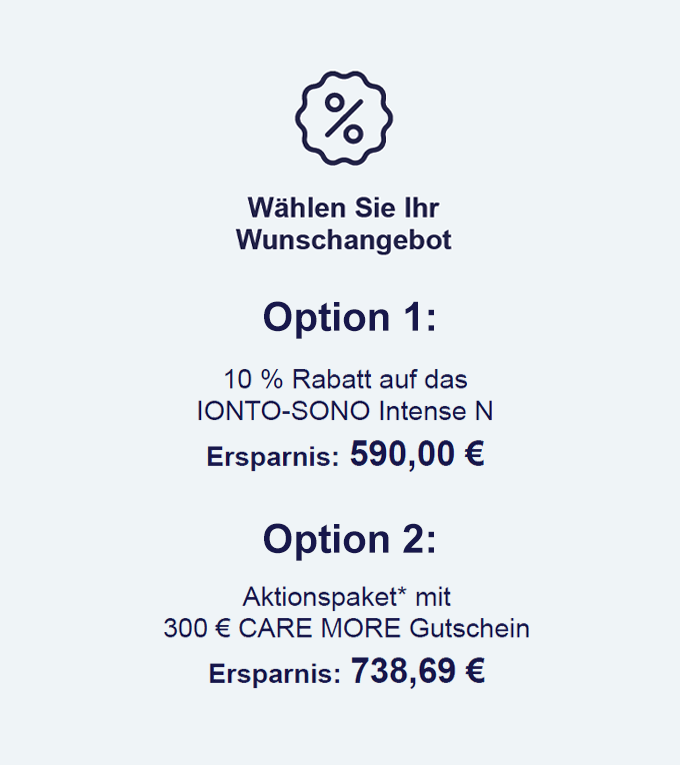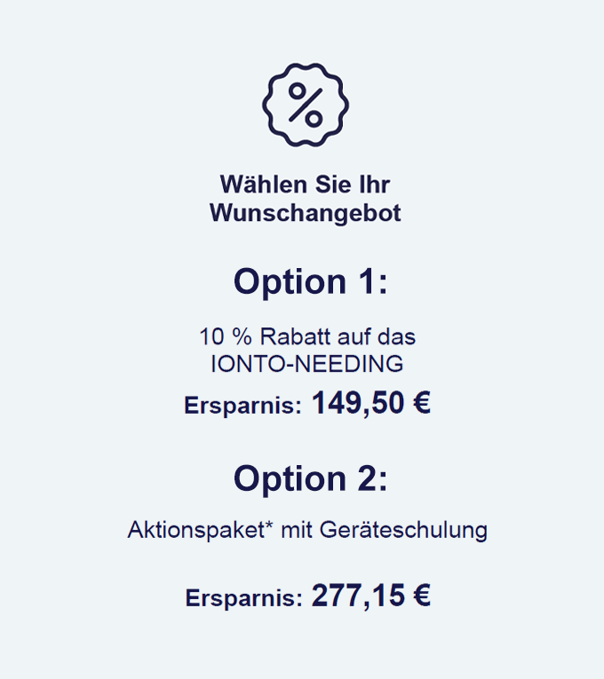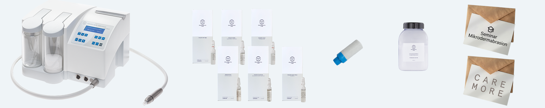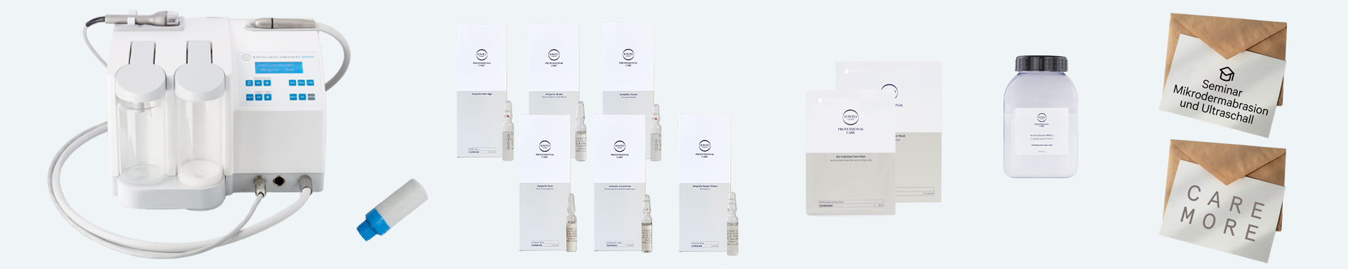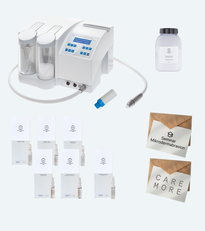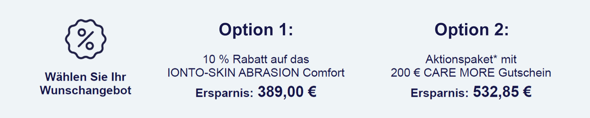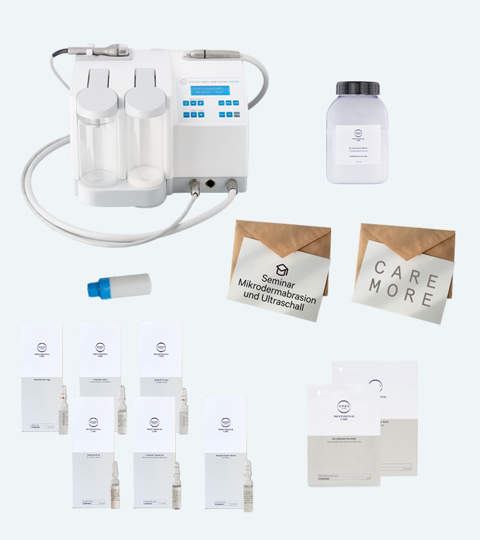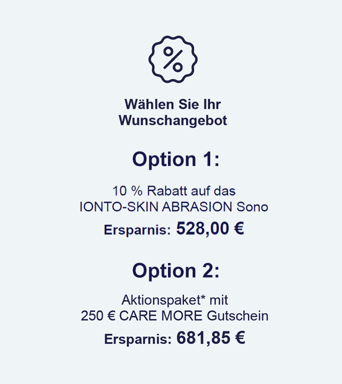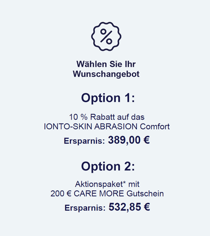 *Aktionspaket beinhaltet: IONTO-SKIN ABRASION Comfort, 6 Sorten Ampullen, Luftfilter, Kristalsand MIKRO 3kg, Training Mikrodermabrasion& CARE MORE Gutschein