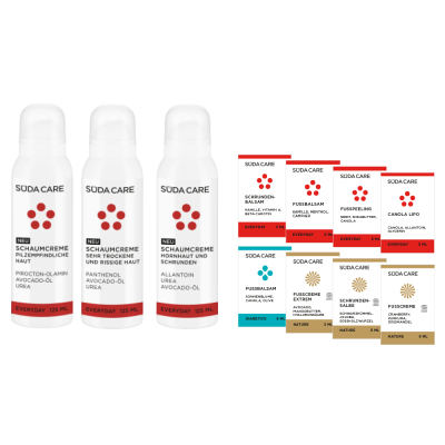 SÜDA CARE Schaumcreme Kennenlernset bestehend aus drei 125 ml Schaumcremedosen und 8 Probesachets der beliebtesten SÜDA CARE Produkte