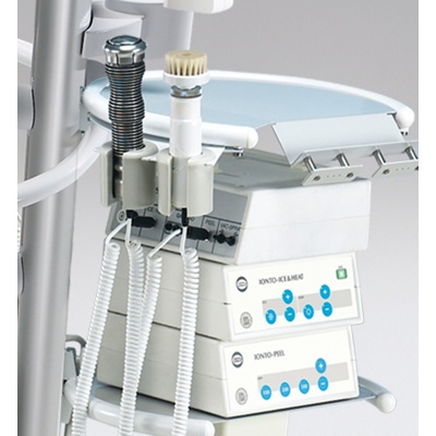 Lässt sich seitlich am Haltering des IONTO-HERB Towers individuell und platzsparend aufrüsten. Mit praktischer Handstückaufnahme der IONTO-COMED BASIC LINE Geräte.